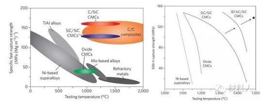 C/SiC但使用寿命显著降低(图2a),更适于高超音速、火箭发动机等方面的应用。氧化物类CMCs可抵抗氧化,但是强度较低(图2a)、不耐蠕变(图2b),一般只用于排气搅拌机等低苛刻环境部件。