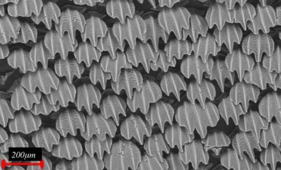 一般情况下,人们会认为物体表面越光滑,阻力就越小。但是,科学家根据仿生学对于鲨鱼皮肤表面进行了研究,发现其表面呈鳞片和类似圆谷状的非光滑盾鳞结构,盾鳞沟槽方向与游动方向平行。正是这些沟槽结构,使得水分子在通过表面时,产生无数微型的涡流,使得产生阻力的“边界层分离点”推后,减小了阻力。人们根据这种原理,在泳衣上设计了百万个细小的棘齿结构,使游泳时能够降低3%的阻力。