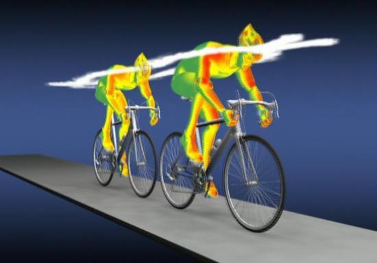 当然,在自行车赛场上,除了讲究高科技的装备,配合也极其重要。我们看到,高水平的自行车选手从来都是不即不离,衔尾相随的。这与大雁在天空飞行的队形非常类似,都是运用了空气动力学原理。尾随选手待在领骑者背后的涡流里,空气阻力会明显减小,这个大家可以理解。而有趣的是,后面选手因为削弱了涡流效应,也能够使前面的运动员受益,减小所承受的压差阻力,实现共赢。这就是为什么两位选手成双要比单独的孤骑速度更快。