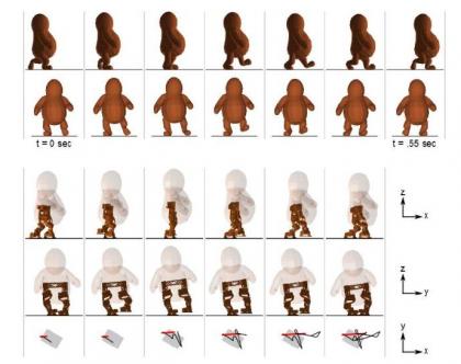 通过模拟动画角色的步行动作,研究人员发现只要做一个有三级自由度的髋关节+单一自由度的膝关节+两级自由度的踝关节就能模仿出动画中角色走路的样子。