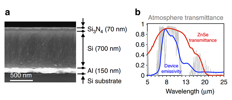降温材料是以硅为基础的多层纳米薄膜所构成,其结构如图三(a)所示。在图三(b)中,材料的吸放热效率几乎和大气层的透射率完美对齐(8-13微米)。科学家指出,多层薄膜中以Si3N4最为关键,其厚度影响吸放热效率甚大。
