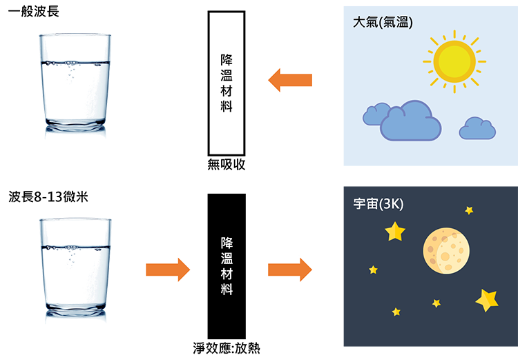 在一般的情况下,物品虽然能透过特殊波段降温,这个波段非常窄,热辐射仍被一般波段给主宰并持续吸热。科学家透过纳米科技制作了一种降温材料,能够改变不同波长吸放热的效率。在一般的波长,这个材料像一件理想的白色衣服,不吸热也不放热。在特殊波段下,这个材料像一件理想的黑色衣服,能够有效吸热也能有效的放热(图二)。在以吸热为主的波段减少吸放热,以放热为主的波段增加吸放热。透过这样的原理,不违反热力第二定律,在烈日下也能持续降温。在一天24小时任何时间,都能将温度维持在比气温低约40度以下。在平均气温为20度的地区,它能降温至约零下20度,能将水自然结成冰。