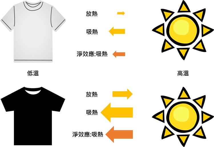 在此短暂离题一下。夏天在户外接受太阳直射,应该穿白色衣服减少吸热。但在室内气温也许比体温低,所以应该穿着黑色增加放热。只考虑热辐射的情况下,我们能推论出最佳穿搭为白色外套配上黑色上衣。(当然穿外套降低热对流会很热…)