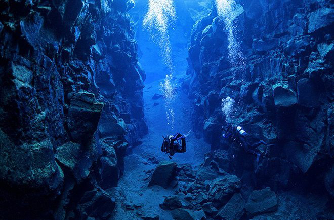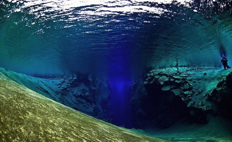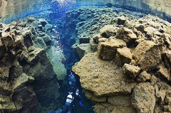 照片中,潜水员在海底峡谷狭窄的裂缝中游弋,身躯被四周陡峭的岩壁包围。而两侧的山崖分别隶属美洲大陆和亚欧大陆,一旦潜水员张开双臂,两个大陆就“触手可及”……即使是水深15米的地方,依然是清澈明净。