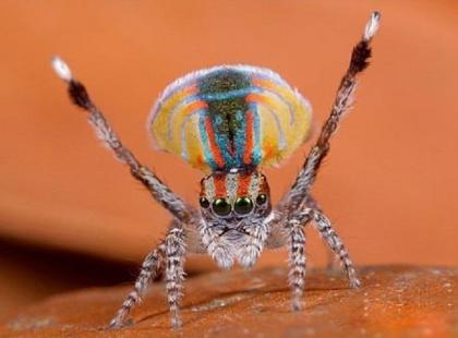 孔雀蜘蛛:这种蜘蛛原产自澳大利亚昆士兰和西南威尔士地区,它们体型细小只有大约4到5毫米。雌性和它们的幼崽都是灰褐色的的,而雄性的腹部会呈现出一种彩虹一样的色彩。当跳起求偶舞时它们会展示出自己的独特腹部,为雌性留下深刻的印象。当成功与雌性交配后,它们会再次跳起舞蹈等待下一次好运的光临。