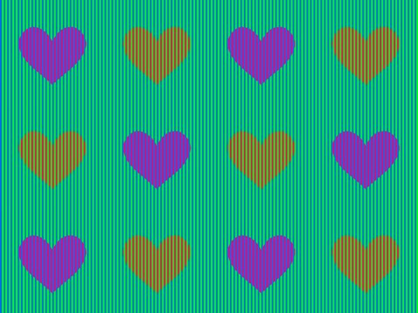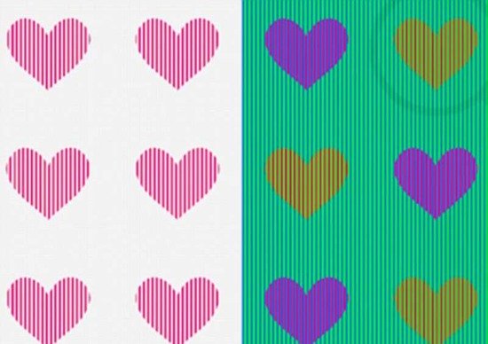 如果你的回答是两种颜色,紫色和橙色,恭喜你,答对了—但是这只是因为的大脑想让你眼睛看到这些颜色(其实并不是蓝色和橙色)。实际上,一旦这些覆盖在图上的条纹被去掉后,心形的颜色都是一样的,一样的粉红色。