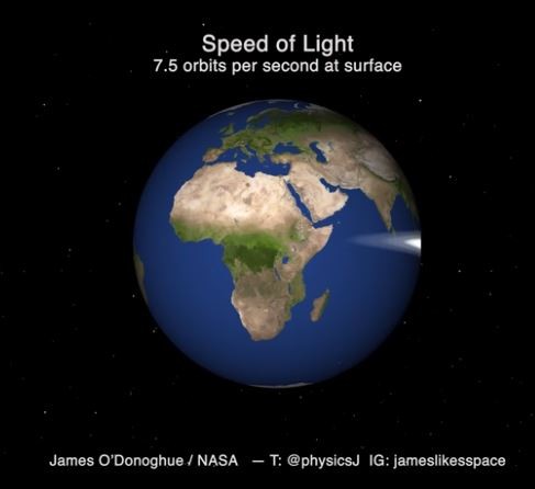 综合报道指出,NASA科学家欧多诺休(James O’Donoghue)最近为了让大家体会到光速有多快,于是做出三个动画影片。第一影片是光从赤道附近绕着地球跑的轨迹,只见赤道上面有一条白色光束快速跑过。如果地球没有大气层阻挡,光每秒可绕地球7.5圈,平均每绕地球一圈只需要0.13秒。
