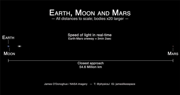 第三动画则探讨到光从地球跑到火星所需的时间,这段距离约5460万公里,光从地球跑到火星单趟就要3分2秒,来回一趟则是6分4秒。这样的时间代表着,如果人类在地球透过远端操控火星探测器,会出现长达数分钟的误差,因此人们必须考虑到未来几分钟可能有的变化,才不会让火星探测器错过目标。