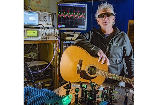 NIST的物理学家Chris Holloway在实验室里轻松地弹起了吉他测试他们的原子收音系统。在新设备准确地录下他的曲子后,Holloway通过电波将其发送出去,收音系统也成功地接收了所有的音符信息。