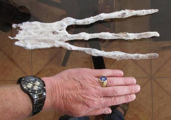 (Mysterious Universe)网站表示,他不像人形,而更像外星人,手只有三个长手指,没有拇指,还有一些其他奇怪的特点,使得确实身份难以辨识。它是否属于外星人的手指头?细长的手指是一个标志,它也有一个细长的头骨?