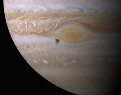 紧靠木星大红斑位置的是北美洲的面积图。正如你从照片中所看到的,相比之下,木星上爆发的巨大风暴能够轻易吞下整个北美洲。