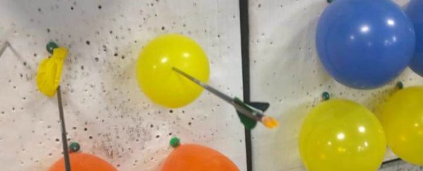 虽然在只有一张照片的情况下很难分析这个情况,但是已经有个类似的实验,就是用羊肉串的木签戳穿一只气球,同时不让气球爆炸。