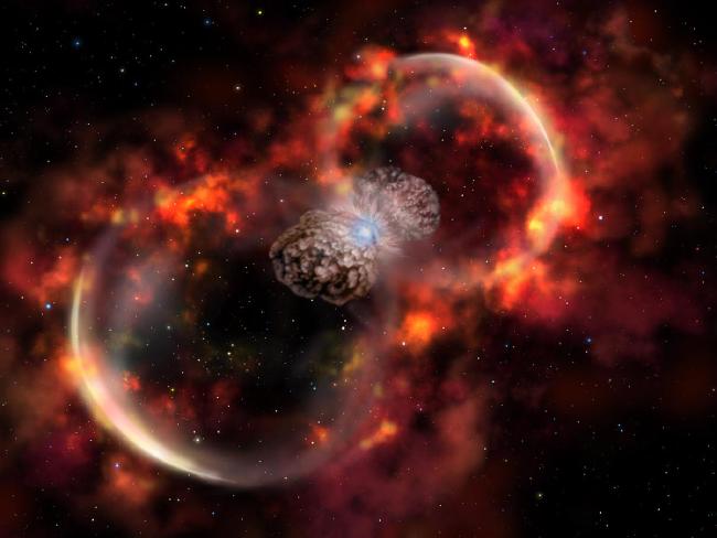 首席作者的亚利桑那大学(University of Arizona)博士班学生Megan Kiminki在一份声明中说:“Eta Carinae是我们所说的超新星假冒者。当它吹走很多的物质时,这颗恒星会变得非常明亮,但它还在那里。”