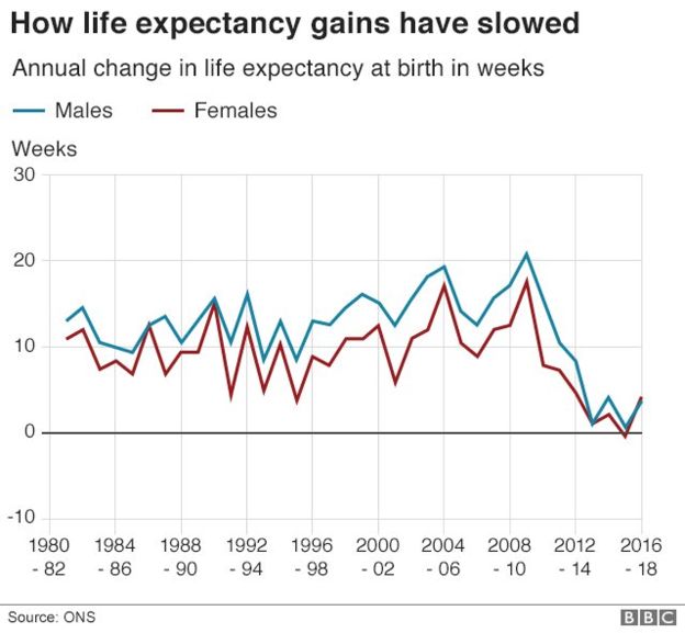 与此同时,英国国民保健署的报告还提到了经济紧缩措施给人们预期寿命所带来的影响。