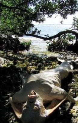 无独有偶,最近美国两名职业捕鲨高手在加勒比海海域捕到11条鲨鱼,其中有一条虎鲨长18.3米,当渔民解剖这条虎鲨时,在它的胃里发现了一副异常奇怪的骸骨,骸骨上身三分之一像成年人的骨骼,但从骨盆开始却是一条大鱼的骨骼。当时渔民将之转交警方,经过验尸官检验,结果证实是一种半人半鱼的生物。