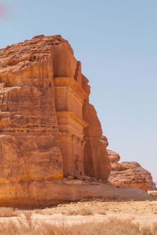 这建筑原文为Qasr al-Farid,意指“孤寂的城堡”,建于公元一世纪,即纳巴泰王国 (Nabatean kingdom) 的时代,该处有上百个类似的遗址,会让人联想到现今约旦地区的雕刻之城佩特拉 (Petra)。