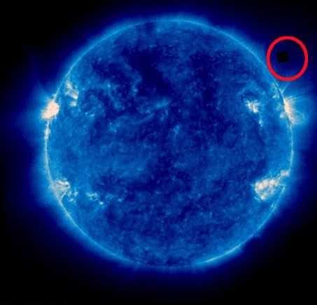 UFO猎人组织近来表示,他们多次在NASA公布的太阳照片上发现一个神秘的方块,对比来看,其面积要比地球还大。