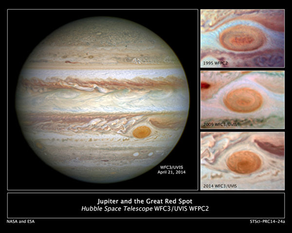 根据哈伯太空望远镜(Hubble Space Telescope)照片显示,木星大红斑正逐渐缩小。原因不明。