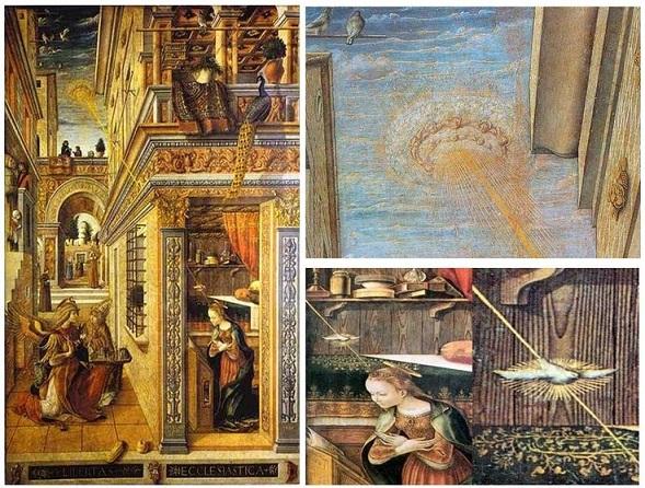 另一幅我们认为非常有趣的作品是由Carlo Crivelli所画的“报喜 (The Annunciation)”。在他的画作中有几个脱颖而出的物体。特别是在天空中有着一个发出了神秘光的神秘物体。