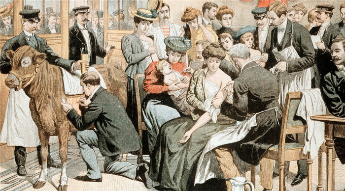 到了18世纪末,一位也曾感染过牛痘、对天花免疫的酪农,他听闻坊间传说,以及观察自己身体的变化后,为了让妻小也不要感染天花,竟拿一根缝补针、刺破耕牛皮肤上的脓包,接着把脓包里的脓液注入他妻子和小孩的手臂里,想让他的妻小也因此不会感染到天花。