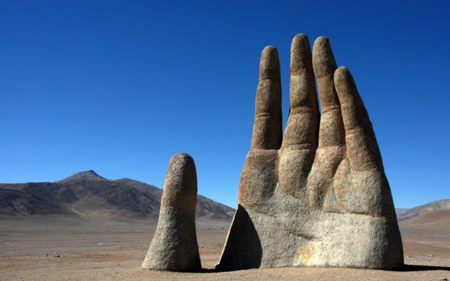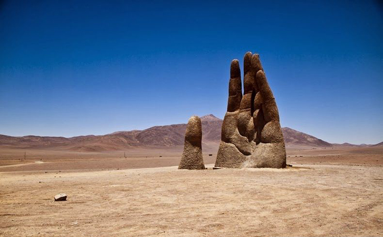 阿塔卡马沙漠不受任何人类活动干扰,它单调的景观似乎更像外星场景,而不是沙漠。安托法加斯塔区(Antofagasta)的城镇南方75公里处的小碎石路,在泛美公路(Pan-American Highway)上标示着1309,它通往一个11公尺高的大型水泥手,它从沙中窜出。这是智利雕刻家Mario Irarrázabal的作品,它叫做La Mano del Desierto,又叫“沙漠之手”。
