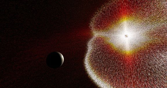 以高达每秒2千公里(1200英里)的速度快速穿越太阳系,日冕大量喷出是磁通的强烈喷发和来自太阳表面的活跃点爆发的带电气体。