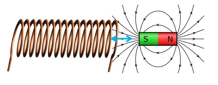 法拉第在1831年发现好几种电磁感应的方式,本图是其中之一:将电线卷成螺旋状,然后让磁铁在它旁边往复运动,磁力线便会不断被电线切割,电线中就会感应出电流。