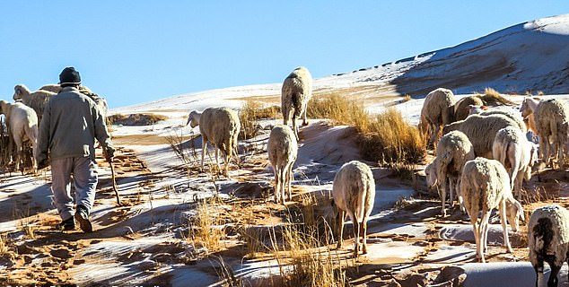不仅如此,就连沙特阿拉伯这种炎热的国家都出现了-2度的低温,当地居民与外国人也纷纷前往降雪的地区观雪,他们应该比南方人看到雪还要兴奋吧!另外,一名摄影师Karim Bouchetata在阿尔及利亚的艾因塞夫拉镇 (Ain Sefra) 上拍下了不少撒哈拉沙漠的雪景,可以看到在-3度的沙漠里,绵羊们对于降雪也感到非常好奇,纷纷围在一旁。