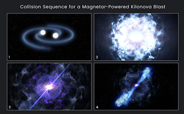 两颗磁星合并产生千新星爆发示意图。(NASA/ESA)