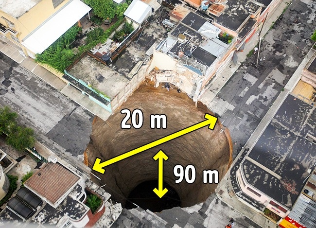 5. 2010年瓜地马拉市沉洞:这个沉洞在2010年时突然在十字路口出现,并且吞噬了一幢三层楼高的工厂,造成这沉洞出现的原因包括热带风暴阿加莎、帕卡亚火山爆发,以及下水管道破裂的关系。