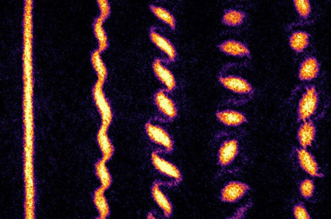 这份新研究终于突破了这个极限,看到了这些原子在量子世界里奇特的形态:细针先是开始摆动,看上去像一缕烟,接着变成如开塞钻(corkscrew)那样的螺旋形态,最后分散成为一串由好几个旋转的团状物排列在一起的形态(见本文标题图片)。这些团状物就像一个个小小的龙卷风,其实是原子云内旋转的原子在相互作用力的影响下而产生的量子晶体结构。