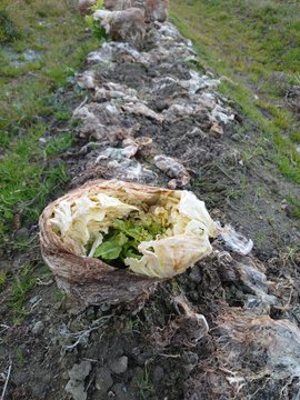 我们印象中的大白菜总是有着翠绿的外观,与照片中的外观完全不符合。看到大白菜被错认为异形蛋,内行人也忍不住跳出来解释,白菜会变成这样子是因为日本的冬天比较冷,菜叶细胞内的水分冻结,导致外侧的叶子枯萎,才会形成这灰灰土土的模样。至于为什么数量会这么多,则是因为如果遇到暖冬销量不好时,农民会将没收成、卖相又不好的白菜放在那当肥料,这个情形也是冬天到春天间才能看见特殊景象。