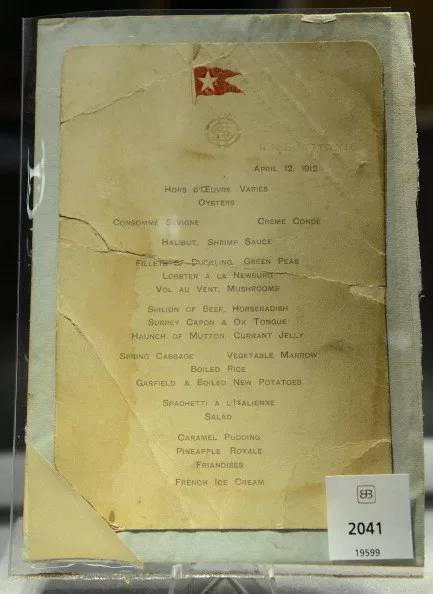 8. 在1912年4月12日时,头等舱的乘客吃了虾酱比目鱼、有着豌豆的鸭肉片、焦糖布丁等。