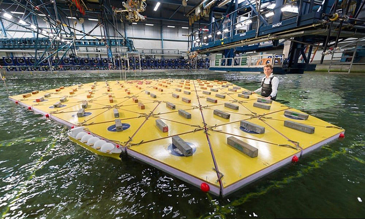 从87个木材和聚苯乙烯(polystyrene)做成的相互连结大型浮动三角形,荷兰海事研究所创造出一个设计原型。就像在现实世界中一样,这些三角形被拴在地板下面。为了在本周的竞标中吸引投资者,他们在水槽中进行试验,包括风浪的模拟。