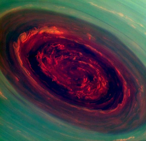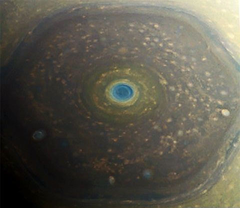 美国太空总署的发言人表示:“土星的北极处存在一个巨大的风暴,其暴风眼比地球上平均的暴风眼大小还要大上50倍。大量的小涡流呈现椭圆状,分布在暴风中。有些涡流以顺时针旋转,但是该暴风跟六角形结构云以逆时针旋转。