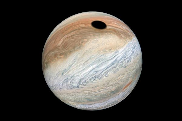 美国宇航局(NASA)的朱诺号(Juno)木星探测器最近发回的照片显示,在木星汹涌翻腾的云层上,有一块巨大的黑斑。分析发现,这原来是木卫一(Io,也称艾奥)在木星上投下的巨大阴影。
