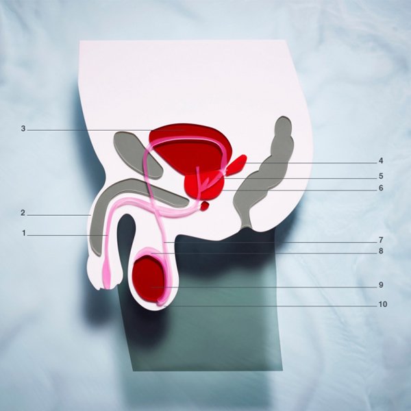 1.尿道 2.阴茎 3.膀胱 4.储精囊 5.射精管 6.前列腺 7.输精管 8.附睾 9.睾丸 10.阴囊
