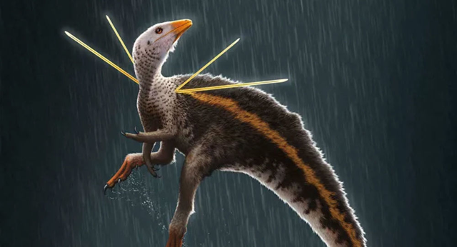 古生物学家最近在巴西东北部发现一种新的恐龙物种,只有鸡那么大,羽毛上有着绚丽的斑纹,最奇特的是,肩膀的两边各伸出两根坚硬的长刺。