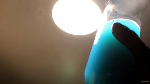 不过喝了一口后,寇迪就找藉口说要检测里面是不是真的氰化物,开始加些其他化合物进去,不愿再喝了(啊就真的会怕嘛)。由于硫酸亚铁会和氰化物产生反应生成亚铁氰化钾,原先透明无色的溶液随即变成暗沉的蓝绿色。为了加强反应,他又加入一点柠檬汁促成酸化,溶液变成漂亮的天蓝色了。