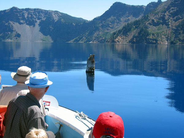 最早是在1896年被地质学家兼探险家的Joseph Diller发现。这个所谓的湖中老人(Old Man of the Lake)就一直笔直地浮着,浮在湖面上的高度大约有1.2公尺(4英尺)。