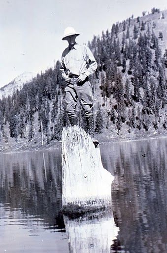一个国家公园管理员站在原木上,大概在1930年