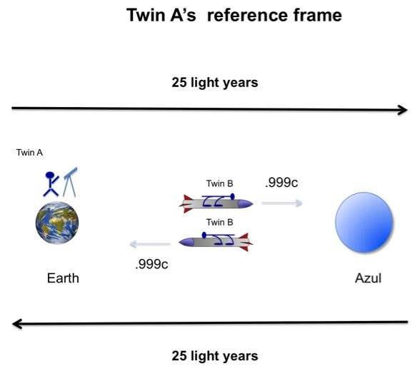因为发射后的第五年,太空船所发出的光会比太空船本身还要慢,所以当太空船在回来地球的时候,地球上的人会同时看见一台已经离开的太空船跟一台正要回来的太空船。