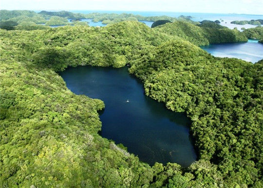 帕劳水母湖位于帕劳群岛其中一座岩岛埃尔·马尔克,湖中数种水母聚生,在接近中午时会浮到水面上进行光合作用,一闪一闪地泛着金光,耀眼又壮观。 每天都有上百万只水母在迁徙途中经过这里,但惟独1998至2000年间没有一只水母出现在湖里,科学家对此也并无合理解释。
