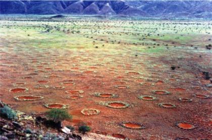 科学家在非洲南部纳米比亚的荒漠草原中,发现一种被称为“仙女圈”的神秘裸点。这种圆形怪圈的大小从直径6.5英尺到40英尺不等。小圈可存活约24年,而较大圈的“寿命”约有75岁。这些怪圈在草原中自然形成、维持原貌,然后在多年后无缘无故地消失,迄今没有人知道原因。