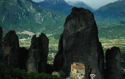 希腊中部地区有一派奇特的景观,数十座20~400米高低不等的柱形垂直岩石群拔地而起,建造在陡峭岩石顶上的24座修道院仿佛悬浮在空中。虔诚的修道士们在此过着与世隔绝的戒律严格的修行生活,直到20世纪初修道院还是靠绳梯和吊车与外界相通。这些修道院是14~16世纪为避免战乱和抵御土耳其人对基督教的迫害而建造的,目前仍有6座修道院在使用之中。