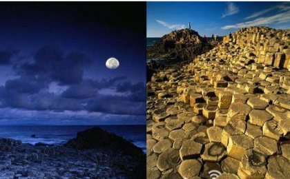 1986年被认定为世界遗产,位于北爱尔兰贝尔法斯特西北约80公里处大西洋的贾恩茨考斯韦海岸110米的断崖上,可见无数石柱突起。总长8公里的海岸线上呈正六角形,共计4万根的石柱由陆地向海里绵绵延伸。其景观有似巨人所造,固有“巨人古道”之美称。是6000万年前太古时代火山喷发后熔岩冷却凝固而形成的。如此排列有序的石柱,不禁让人怀疑不是天然雕琢而是人工有意堆积而成的。