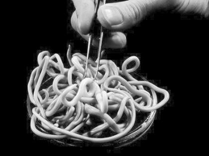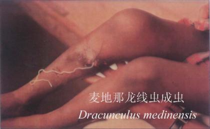 麦地那龙线虫也叫几内亚虫,这是又一种长着丑陋脑袋的寄生虫,成虫最长可长到78厘米。麦地那龙线虫的幼虫感染一些水生甲壳内生物,如通常生活在死水潭中的水蚤等。人们在不知情的情况下喝了这种不洁水,水蚤在体内被消化,释放出寄生在水蚤体内的麦地那龙线虫的幼虫,在感染人体几个月后,雌雄麦地那龙线虫交配之后,雄虫死去,被人体消化吸收,雌虫则向人的腿部和脚部转移。