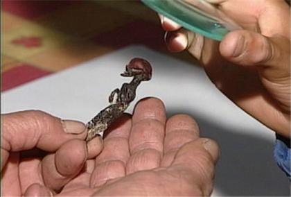 这个外星人生命体的发现者是奥斯卡-穆尼奥斯,他与2003年12月19日在一个废弃的教堂附近发现了这具干尸。当地一家报纸报道称,这具干尸最初被裹在一个白布做成的容器中。