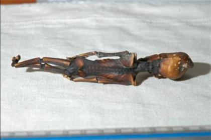 这具长约十五分米的尸体已经风干,外形和人类神似。它有着坚硬的牙齿和十条肋骨,皮肤颜色比人类要深。目前科学家已经成功揭开了这个神秘生命体的秘密。