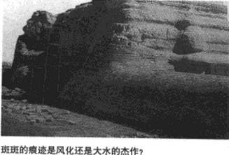 岁月的沧桑在狮身人面像的表面,留下了许多很深的沟壑,它们全都横行排列.一层层密存在狮身人面像的表面,使这座古老的石雕显得更加苍老和神秘。人们普遍认为,这一奇特的现象的产生,是因为古埃及地区干燥的气候和强烈的沙漠风暴使狮身人面像受到了风化。一直以来,无论是正统的古埃及学研究者,还是到此来做实地考察的各类专家,都对这一解释深信不疑。然而最近却有研究者对此提出了挑战。他们认为这些沟壑是雨水冲刷而形成的,决非传统的考古学者们所认为的那样是因风沙任蚀而形成的。他们认为矗立在吉萨西部高崖上的雕像,除头部之外,整个狮身都现出无可争辩的水浸迹象。他们的观点立即招致了大批古埃及学者的强烈不满,许多研究者对此一片哗然。但是他们坚持认为过去埃及种多次受到海水和尼罗河特大洪水的困扰。就在不那么遥远的古代还出现过一次这样的洪灾,人们认为这是最近一次冰川融化而造成的。一般人认为,最后一次冰季的时间是在公元前10500年前后,而尼罗河周期性特大洪水就发生在这之后。在公元前10000年前后发生的那次大洪水是最后一次。因此可以推断,如果狮身人面像受过水浸,那它一定是在洪水发生之前建成的。
